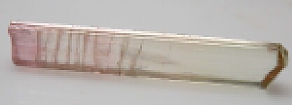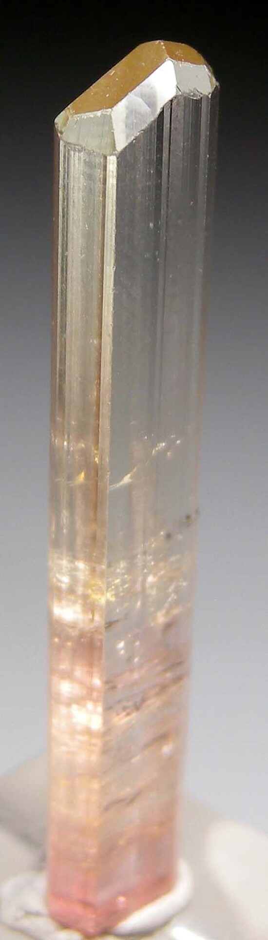 Beutiful single Tourmaline with two qualities I love about Congo Tourmaline - high transparency and yellow color - an uncommon hue for Tourmaline. A glassy transparent crystal from recent finds in the Congo. Congolese Tourmaline can get very transparent and this is a great example of that quality - transparent and glass-like for it's entire length. The color is light yellow, slightly reddish at the base and slightly green at the termination. Undamaged and weighs 2.19 grams. Valued at $350.