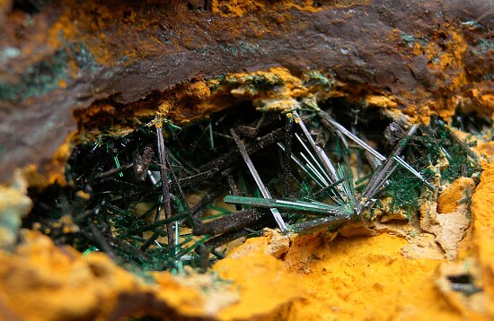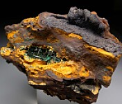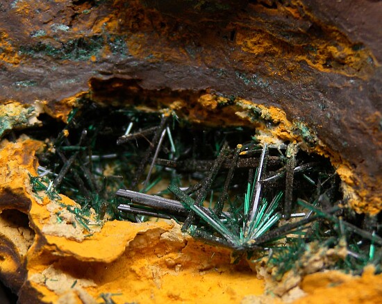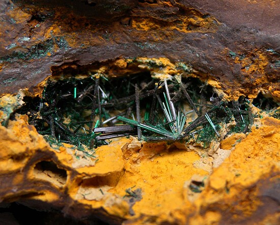 Bright green crystals of Atacamite well protected in an open vug. Moe commonly seen as thick nodular masses, these free standing crystals are very appealing. Old hard to find material.