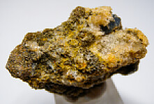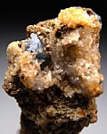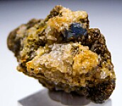 A 7mm blue Scorodite crystal set in tiny Quartz crystals. The matrix is Quartz rich with tiny Pyrite crystals and yellowish Beudantite.7mm is good sized for a single isolated Scorodite crystal. Valued at $150.
