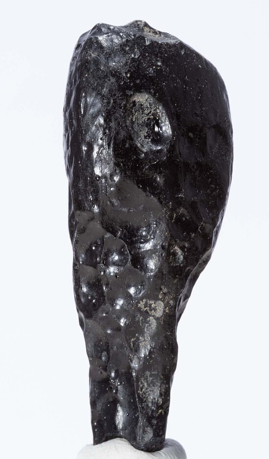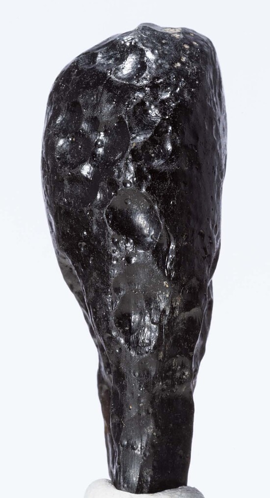 Translucent Tektite with typical surface pitting and teardrop shape from Thailand. Tektites are natural glass formed from terrestrial debris ejected during meteorite impacts. Ex. Chuck Trantham collection. This was the largest, best Tektite in his collection.