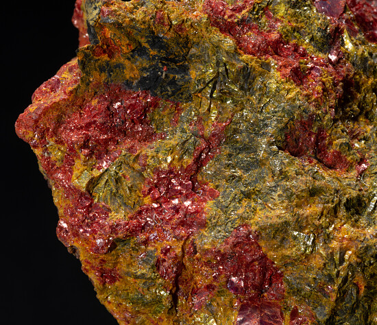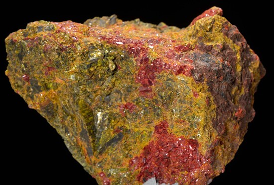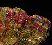 Bright red, platy Getchellite crystals in yellow Orpiment from the Getchell Mine in Nevada. Getchellite is a rare arsenic and antimony sulfide mineral and the Getchell Mine is the Type locality for the species.