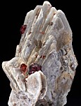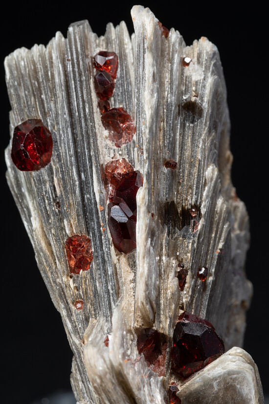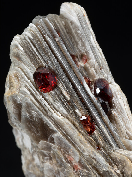 Shiny 'books' of triangular Muscovite crystals with attached red Spessartine crystals. The garnets reach 6mm in diamter.