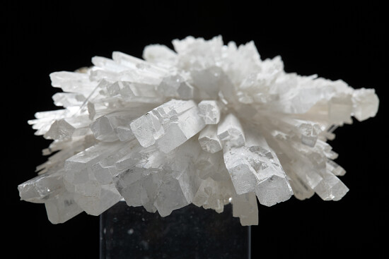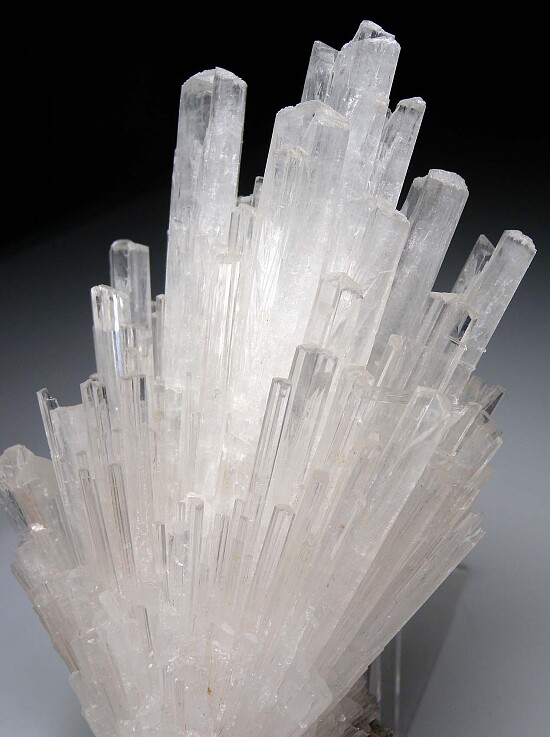 Large spray of translucent to transparent Scolecite crystals. The crystals reach 14cm tall and most have perfect terminations. A small amount of matrix is attached to the back.