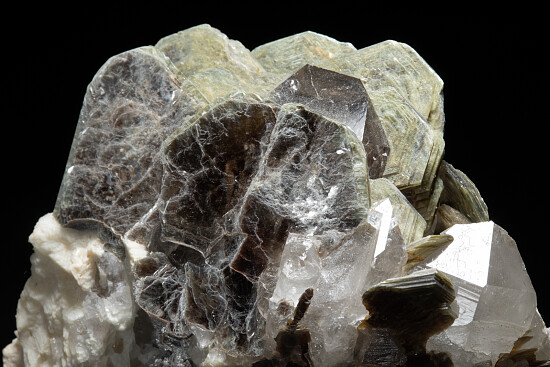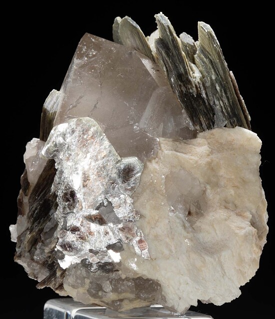 Here's a good sized piece of a pegmatite pocket from the Cruziero tourmaline mine in Brazil. A large light smokey Quartz crystal is surrounded by silvery Muscovite. I love to imagine the bright red Tourmaline crystals that likely shared the same pocket as these crystals!