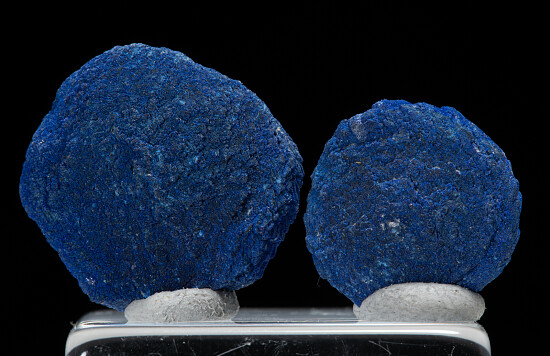 Flat, rounded nodules of solid Azurite with Malachite in a hard, Kaolinitic clay matrix. Colorful and showy specimen that is distinctive to this locality. Comes with two additional Azurite nodules to 2cm in size.