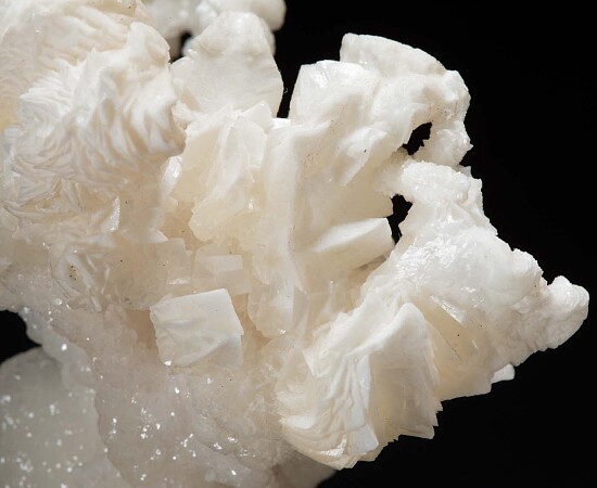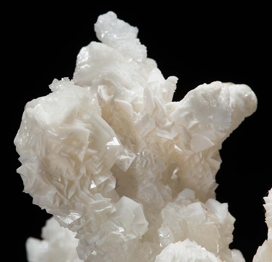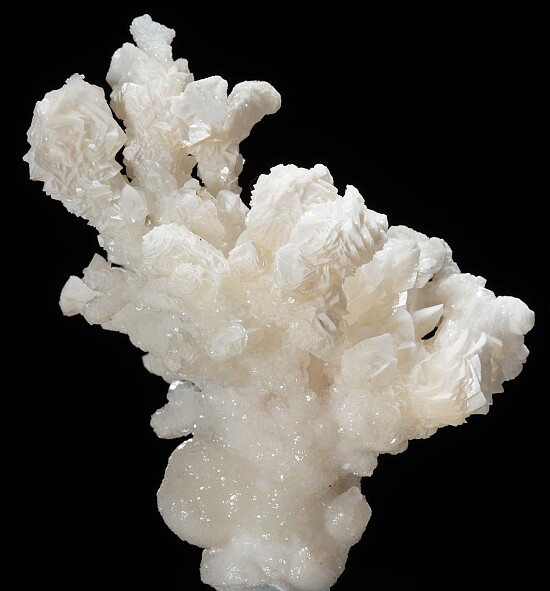 Coral-like formation of white Argonite from the Bristol Silver Mine. A first generation of botryoidal, more translucent Aragonite is partially coated by larger, more opaque white Aragonite crystals on the tips.