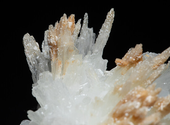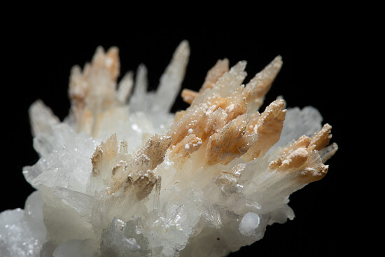 Spiky crystals of Aragonite atop white stalactites of Calcite from the famous and historic Bisbee mining district. Comes with an old dealer label showing a price of $150.