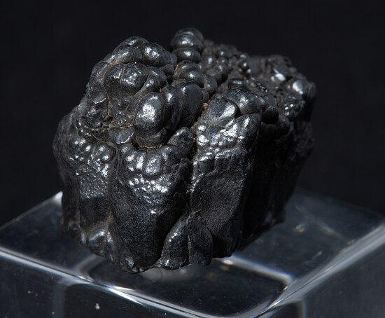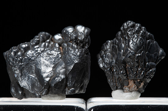 Two specimens of black metallic Psilomelane from New Mexico. Smooth, botryoidal formations over the top surfaces.
