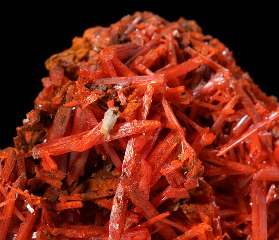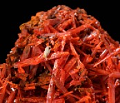Cluster of bright, fiery red/orange Crocoite crystals from the Adelaide Mine. Nothing but intergrown crystals (no matrix) showing all around.