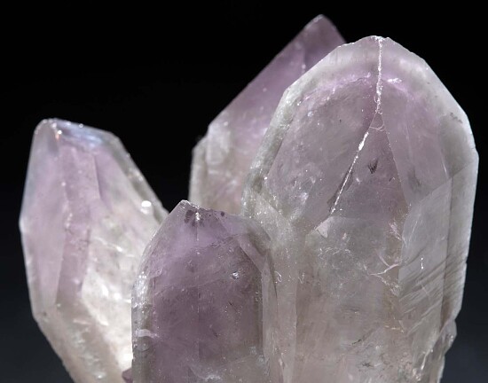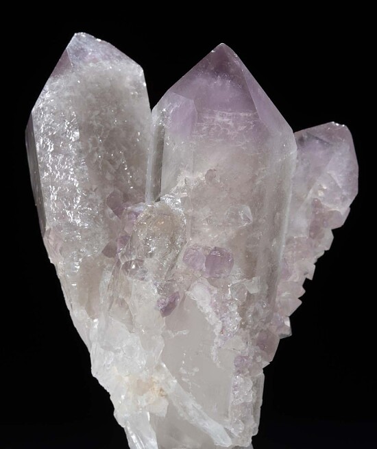 Diverging cluster of four large Amethyst crystals from Kenya. In the center are smaller crystals and small points also stud the sides of the larger crystals. Beautiful and uncommon crystals in an aesthetic formation.