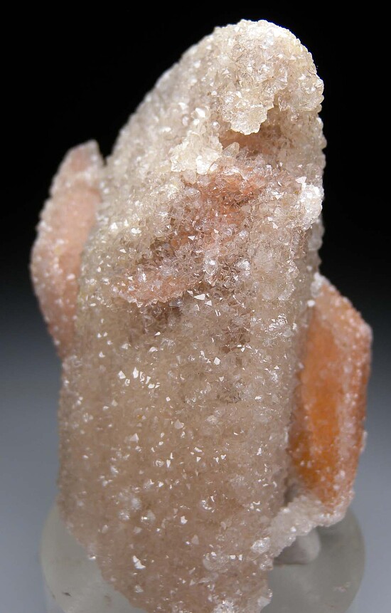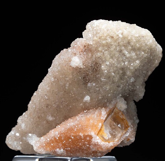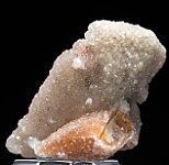 A large single Danburite crystal with attached orange scalenohedral Calcite crystals, all of which are coated by drusy Quartz crystals. The Calcite crystals reach 3.5cm in length. Much different than your typical Danburite crystal!