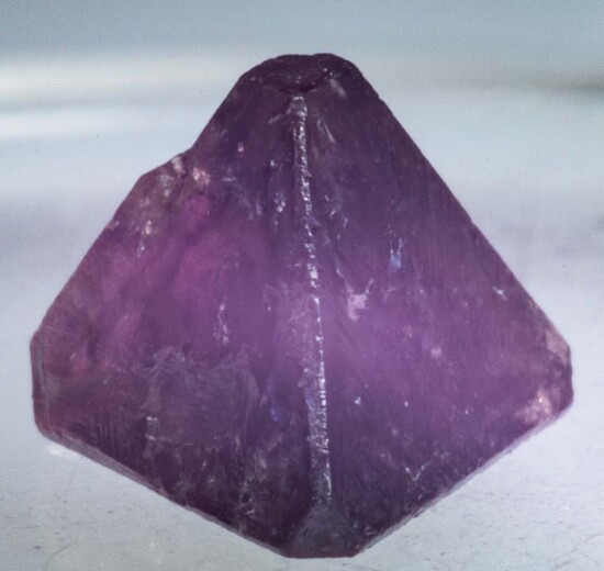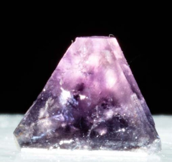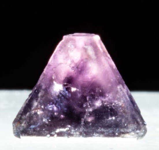 Tetrahedral crystal of Chambersite, a rare mineral found in salt formations in a small number of localities worldwide. Translucent with 'Amethyst' purple in color. Collected by Fred Pough in 1970. This is a complete floater crystal with flat tips. Ex. Chuck Trantham collection.