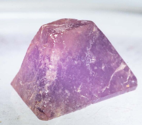 Tetrahedral crystal of Chambersite, a rare mineral found in salt formations in a small number of localities worldwide. Translucent 'Amethyst' purple in color and collected by Fred Pough in 1970. This is a complete undamaged floater crystal with one tip more truncated than the others and one small etched cavity. Ex. Chuck Trantham collection.