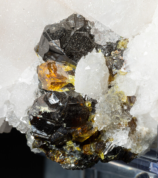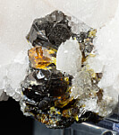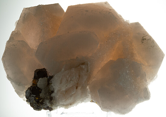 Cluster of large pink Mangano Calcite crystals with attached Pyrite and Sphalerite. The Mangano Calcite crystals are covered by a druse of tiny Quartz crystals and are in excellent condition. Showy large display specimen.
