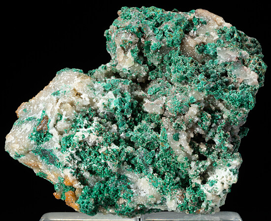 Colorful classic old Tsumeb specimen with a variety of minerals. Squar wafers of Wulfenite crystals to 5mm on edge are abundant, along with Malachite, Mimetite, Calcite all on a Quartz matrix. The specimen is vuggy with lots of good crystals on both sides.