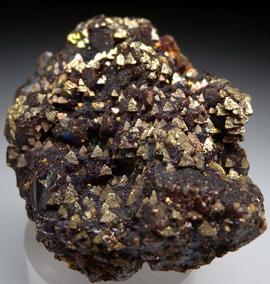 Specimen of solid, iridescent Sphalerite crystals with oriented Chalcopyrite crystals. This is a great example of an old USA classic and when you turn it in hand and catch the reflections off the Chalcopyrite faces it's spectacular. Come siwth a couple old labels which misidentify the Chalcopyrite ad Marcasite. Valued at $200.