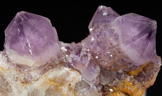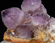 Lustrous Amethyst Quartz crystals known as 'Cactus Quartz' from South Africa. There are two generations of growth. The first generation has large Amethyst crystals measuring about 1.4cm thick, with a second generation of smaller crystals attached to the prism faces on the larger crystals. Undamaged, valued at $150.
