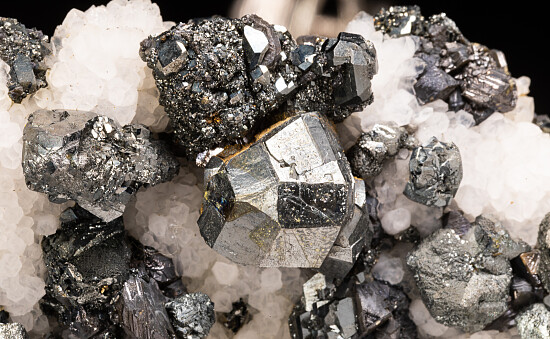 Old Mexican classic of lustrous metallic Tennantite crystals on Quartz crystals from Zacatecas, Mexico. Well crystallized on both sides with more isolated crystals on the front.
