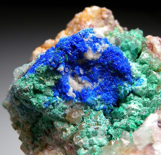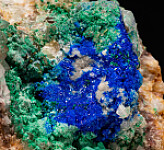 A 3cm wide crystal of Linarite after Galena on matrix. The Linarite has bright 'electric' blue color and is associated with green Brochantite, Anglesite, and Quartz crystals. Comes with an old collection label and another old dealer label showing a likely decades old price of $130. Super colorful example!