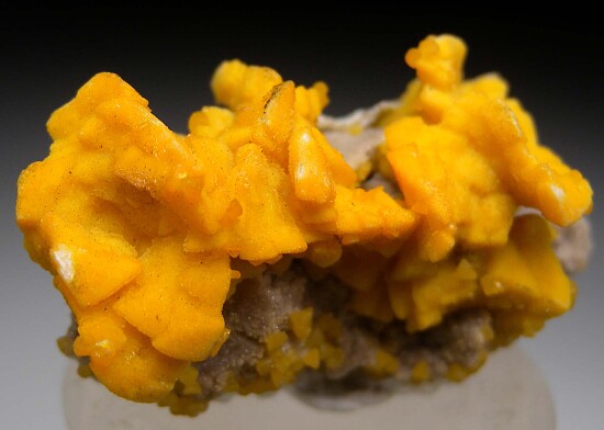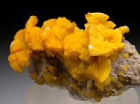 Bright yellow crystals of Smithsonite replacing Dolomite, with the curving form of the former Dolomite crystals clearly evident. Smaller individual Smithsonite crystals are scattered across the surface of the matrix. The bright color is caused by inclusions of Greenockite. Comes with an old Ernie Schlichter label. Beautiful specimen!
