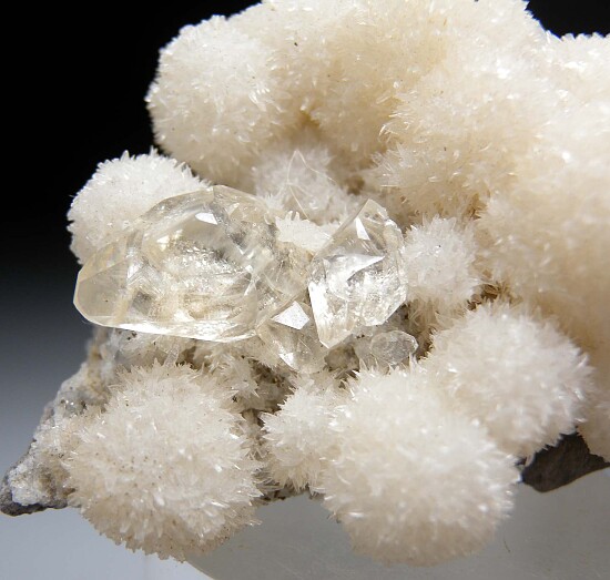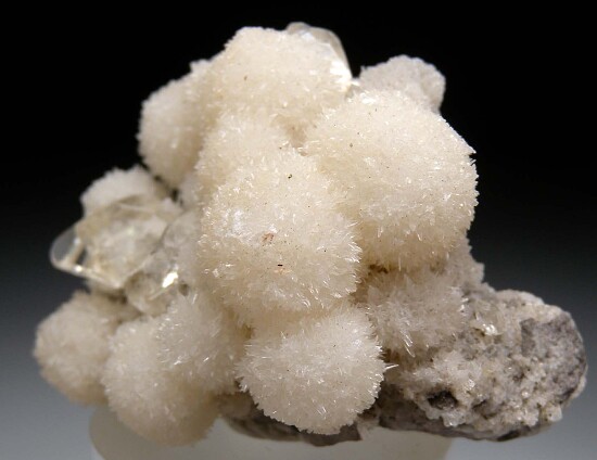 Spherical crystal groups of Strontianite from the Meckley Limestone quarry in Pennsylvania. The crystal groups reach 1.4cm in diameter and there are also superb, gem-like transparent Calcite crystals in association.