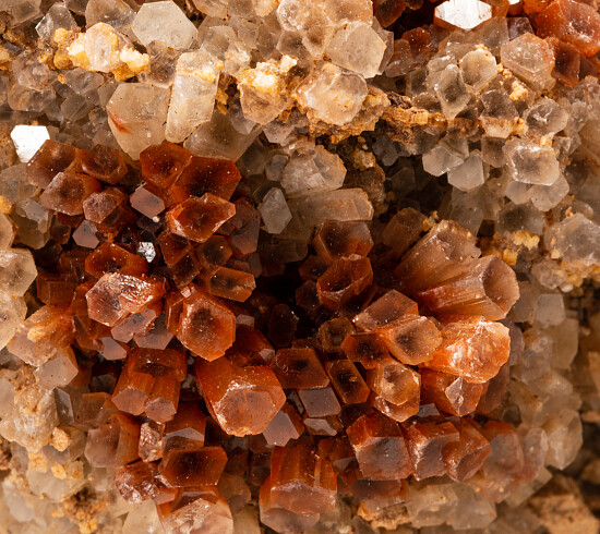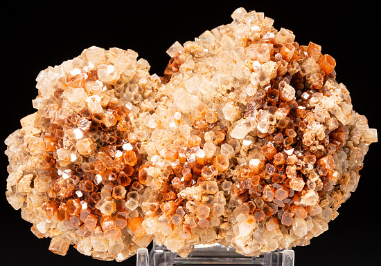 Interconnected radial groups of Aragonite crystals from Morocco. Large sized and colorful example with red and white/colorless crystals all over. Hundreds of crystals with crystals sticking out in all directions on every side. A nice one in excellent condition.