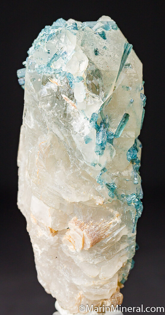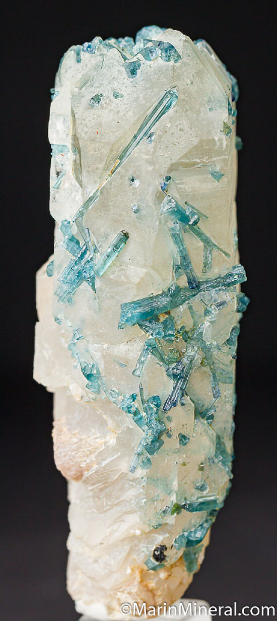 Tall single Quartz crystal included by and covered by blue Tourmaline var. Indicolite crystals. The longer Tourmaline crystals are 2-2.5cm. The crystals all are over with a dense concentration on the termination of the Quartz. Out of an old collection built in the 1970s-80s.