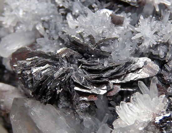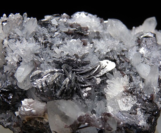 Galena on Quartz crystals over a sulfide matrix hosting platy crystal groups of Semseyite. The main crystal group is 1.8cm wide with wonderful metallic crystals.