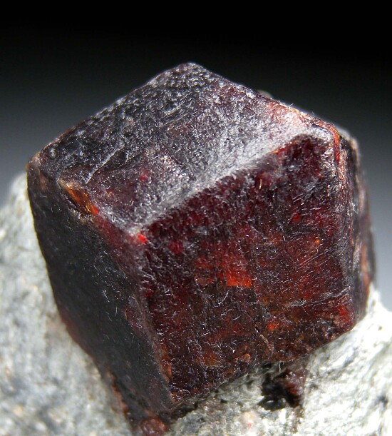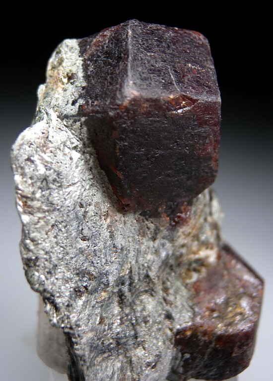 Classic Almandine specimen from Zillertal featuring two dark reddish-brown Almandine crystals in a schist matrix. The well-formed dodecahedral crystals reach 3.3cm in size.