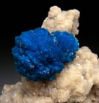 Vivid blue spherical clusters of Cavansite on matrix with white Stilbite crystals. The Cavansite crystal group is 2.8cm wide, clean and undamaged.