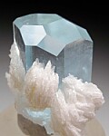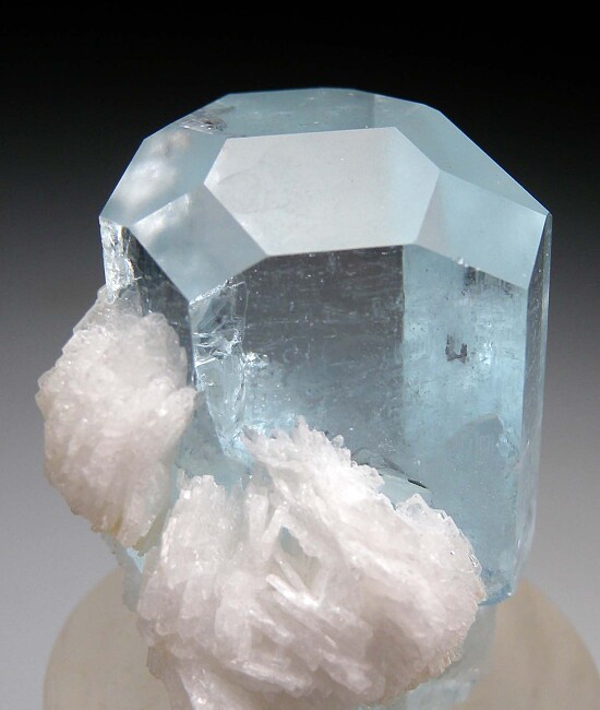 Gemmy blue Aquamarine crystal with attached snow-white Albite. The Aqua is clean and nearly pristine and has excellent blue color.