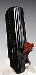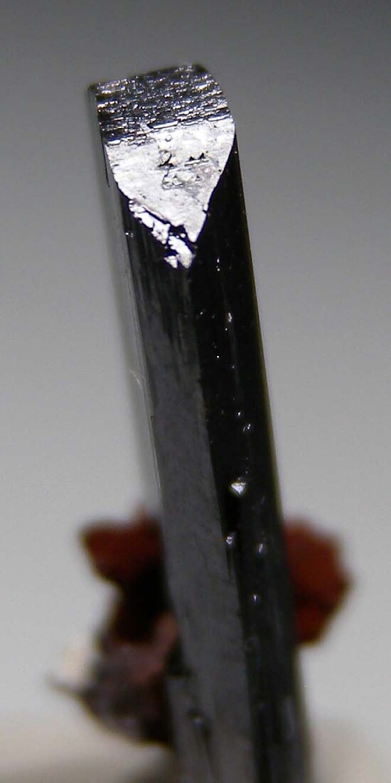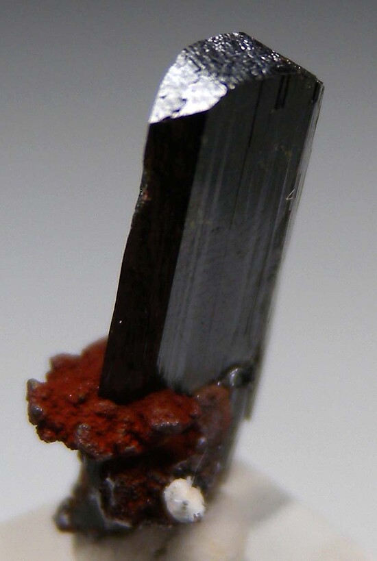 Single well terminated Olivenite crystal from the Milpillas Mine. Like many other minerals found at this mine, these rank among the world's best for species. A slender flattened single crystal with glossy luster. Complete all around nearly pristine with a small bit of Limonite near the base at one side and a small chip/indentation on the same side where likely another small piece of Limonite was attached. Good sized single crystal of high quality.