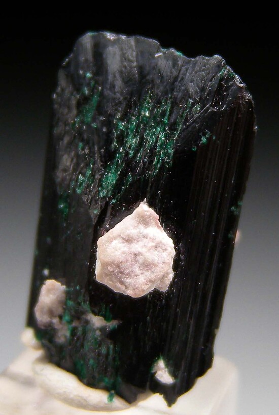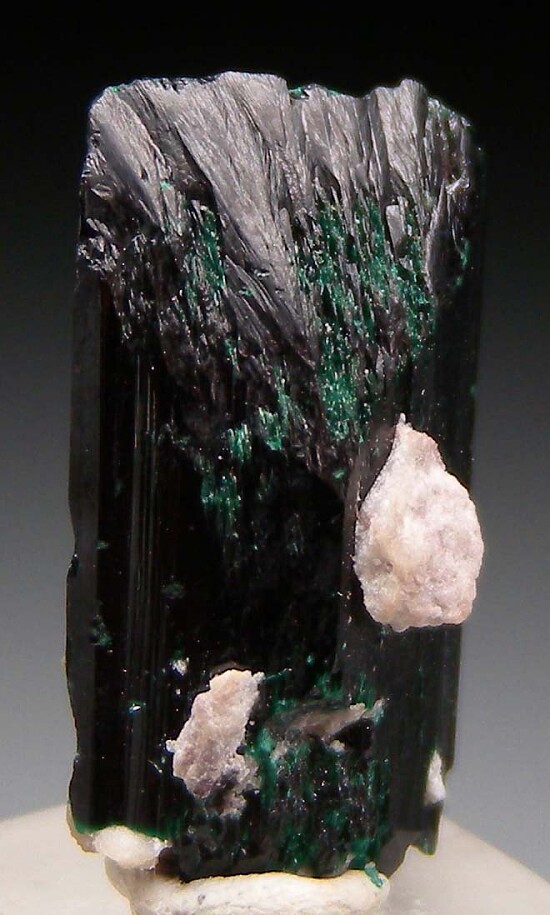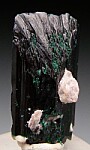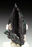 Stout single Brochantite crystal from the Milpillas Mine. The crystal is complete all around with just some minor edge chipping and pieces of attached matrix. A superb thumbnail for the species that was formerly in the personal collection of a Mexican mineral dealer.
