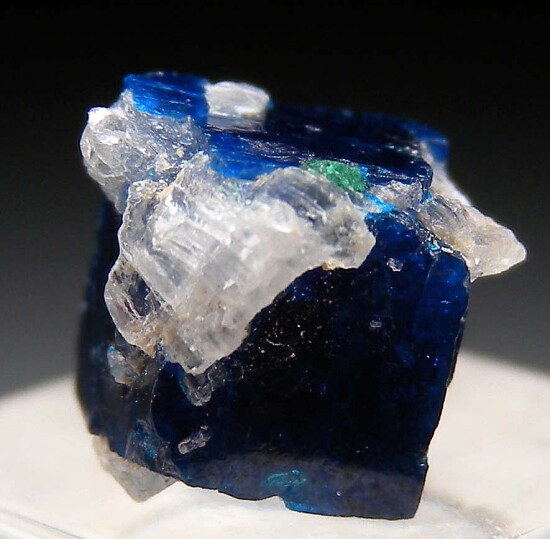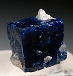 Single cube of deep blue Boleite. Boleite is a rare lead-silver-copper halide mineral that is at it's best from this locality. This a good sized complete cube, with sharp edges and good luster and areas of attached white Gypsum.