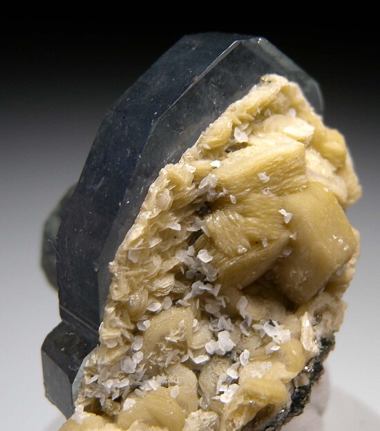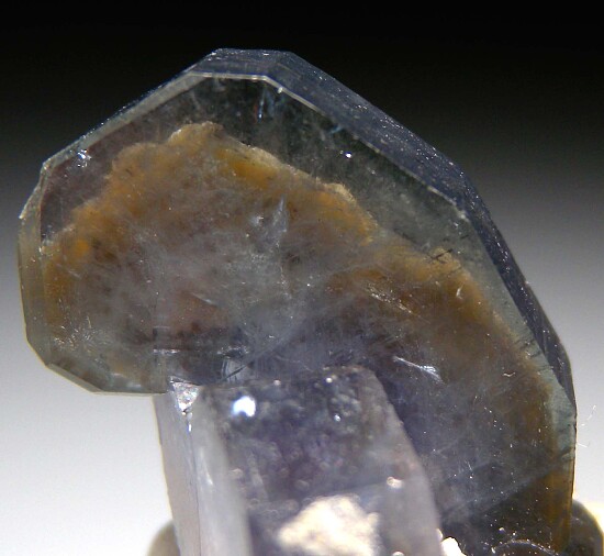 Glassy, transparent purple/blue Apatite crystals with attached Siderite crystals. The main crystal is 2.8cm tall.