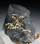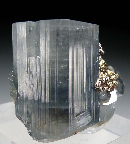 Exquisite cluster of translucent to transparent Apatite crystals partially coated by Pyrite crystals. The main Apatite crystal is 2.2 x 1.6cm. The crystals have a blue/grey coloration, transparency, and great luster. Undamaged and better than photos.