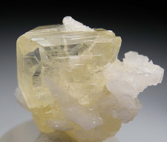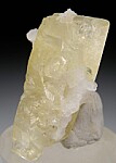 Single crystal of translucent to transparent yellow Amblygonite intergrown with white Albite. Amblygonite is a rare lithium-aluminum phosphate species that is not commonly seen in fine display quality crystals. This is a well crystallized specimen all around with just a small area of contacting on the backside. Translucent with transparent gem areas. Some faces show light striations and others are smooth with high glassy luster. Excellent for the species!