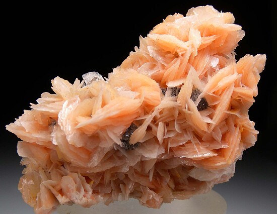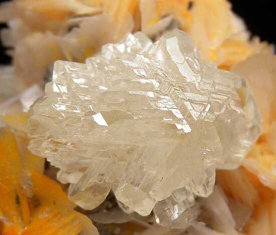 Reticulated Cerussite and pink bladed Barite crystals on a matrix of Barite with Galena. The main Cerussite cluster is superb for the locality, white and highly lustrous and 2cm wide. There are many additional gemmy Cerussite crystals mixed in with the Barite on the fron side. Reticulated Cerussite is uncommon from Mibladen. The back side is covered by pink Barite crystals.