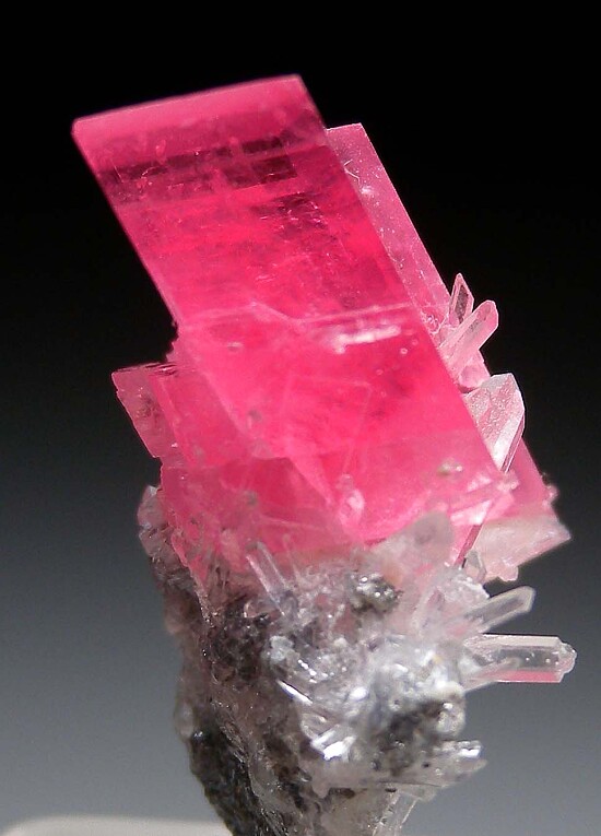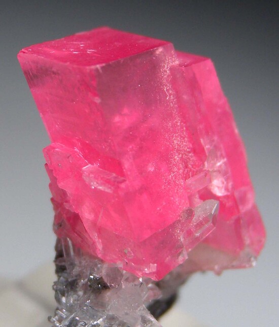 Single red Rhodochrosite rhomb on Quartz crystals. The Rhodo has gem quality areas and is 2cm wide on the diagonal.