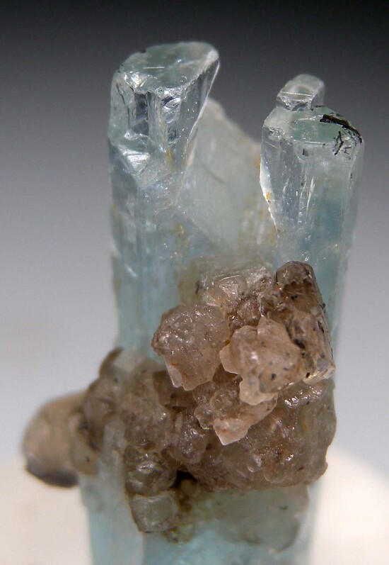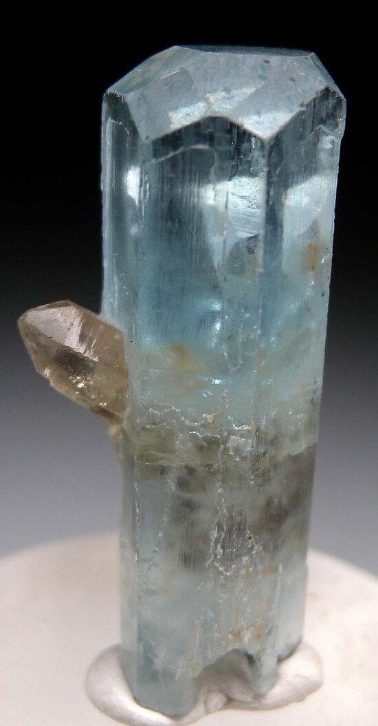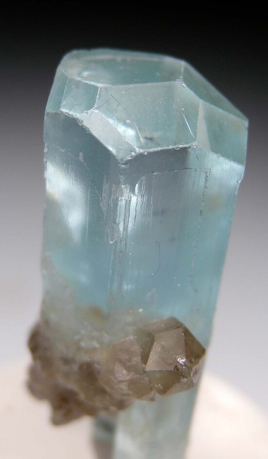 Transparent, double terminated Aqua from the Mourne Mountains in Ireland. This is an excellent Aquamarine from the locality with a highly transprent top zone and attached smokey Quartz crystals. The bottom is also terminated and has a notch where it grew over a smokey Quartz crystal. Ex. Russell McFall, Tim Sherburn collections.