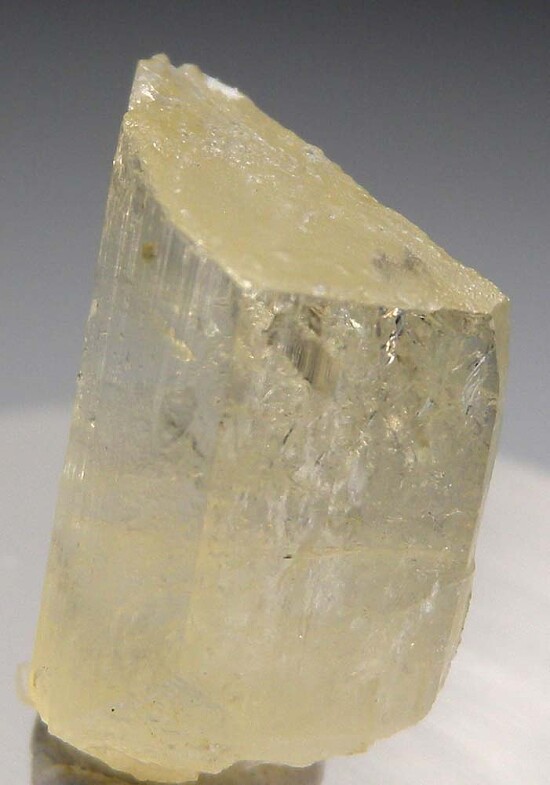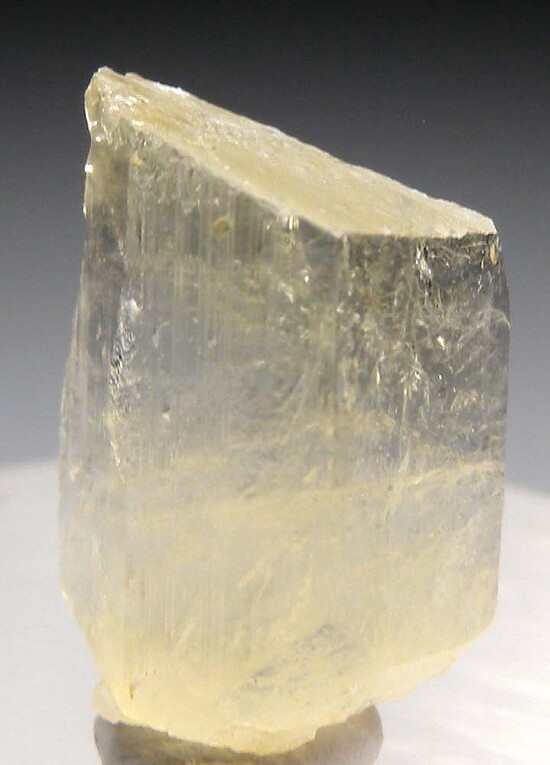 Gemmy single crystal of transparent yellow Amblygonite from Brazil. Amblygonite is a rare lithium-aluminum phosphate species that is not commonly seen in fine display quality crystals. This crystal is well terminated with good crystals faces on front and sides and a cleavage face on back. These are not commonly seen and I bought the entire pocket that was available at this year's Tucson show. A rarity for a thumbnail collector or gem crystal collector.