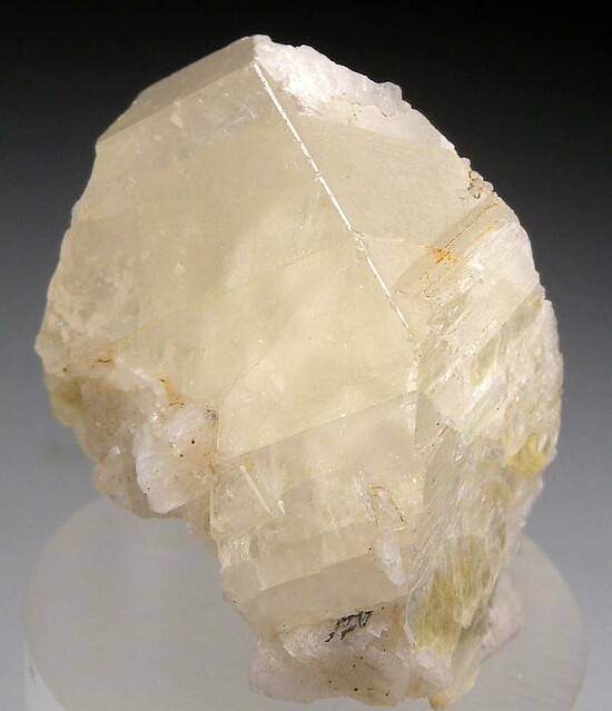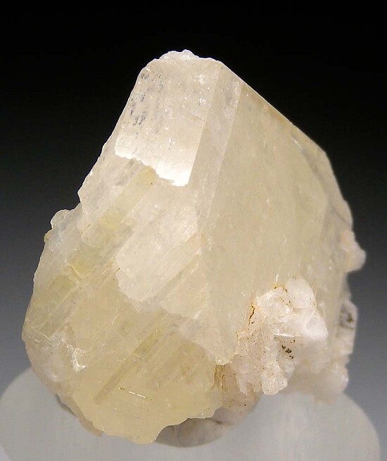 Single crystal of translucent to transparent yellow Amblygonite from Brazil. Amblygonite is a rare lithium-aluminum phosphate species that is not commonly seen in fine display quality crystals. This crystal has large, flat glossy faces on the front and sides and is partially intergrown with Mica and Albite. These are not commonly seen and I bought the entire pocket that was available at this year's Tucson show. A rarity for a gem crystal collector.