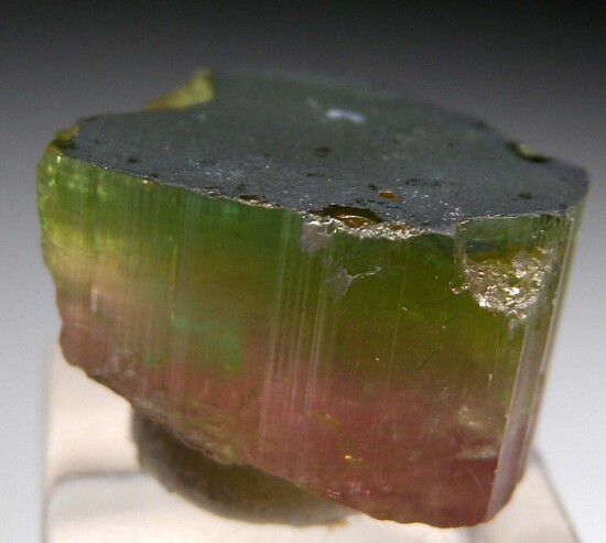 Single bi-color Tourmaline crystal from the famous Himalaya Mine in California. A well terminated crystal with a green cap over a pink body. Weighs 5.2 grams and is nice and gemmy, valued at $100.