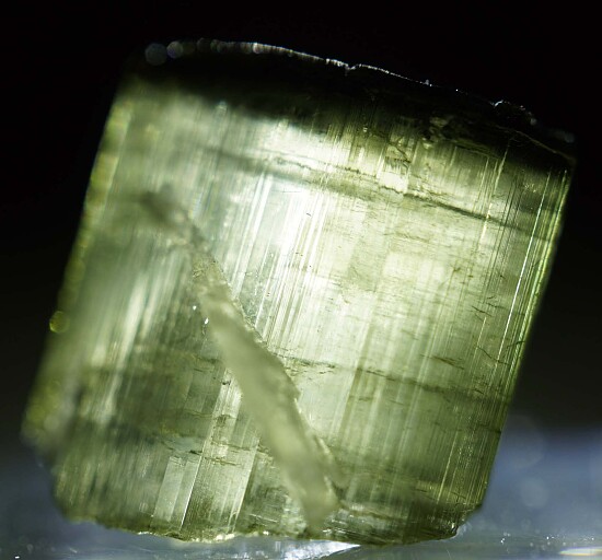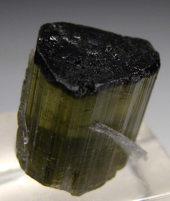 Single transparent green Tourmaline crystal from the famous Himalaya Mine in California. A well terminated crystal with a thin black cap over a green body. Weighs 3.12 grams and is nice and gemmy.