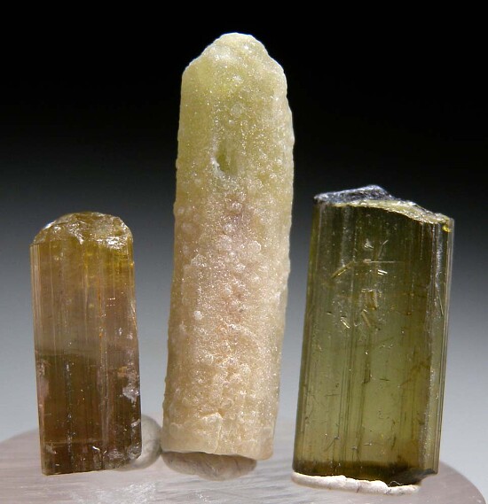 Lot of 9 crystals from the Himalaya Mine. Eight of the crystals are Tourmaline of various colors, some transparent, some coated with a thin layer of Quartz. The single Hambergite crystal is 3.2cm long. Total weight of the lot is 8.52 grams. A great lot to add diversity to a Himalaya mine specimen suite.