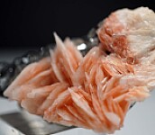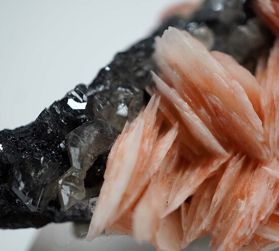 Pink blades of Barite crystals atop Galena with glassy, transparent crystals of Cerussite. The Cerussite occur on top of the Galena and reach 7mm in size.