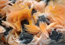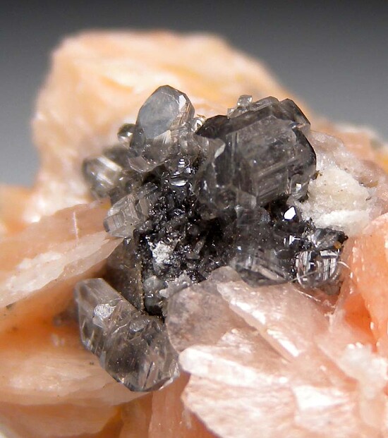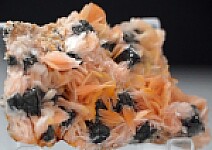 Pinkish orange blades of Barite crystals intergrown with Galena cubes partially altered to Cerussite. The Cerussite on the Galena occurs as small, sugary drusy coatings and also larger glassy crystals to 4mm in size.