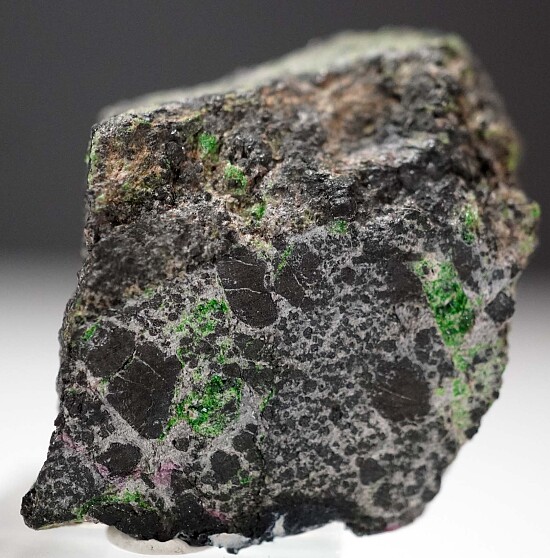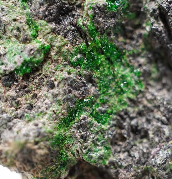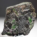 Rare, bright green Uvarovite crystals on Chromite. Uncommon species of garnet that are coveted by California collectors.