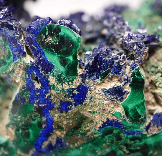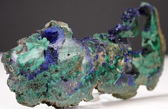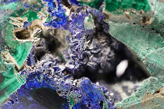 Largecut and polished specimen of solid Malachite and Azurite from China. There are also nice crystals of Azurite present on the sides and in cavities. You get the best of both worlds on this one - the color and banding from the polished face plus the crystallized Azurite on velvety Malachite.