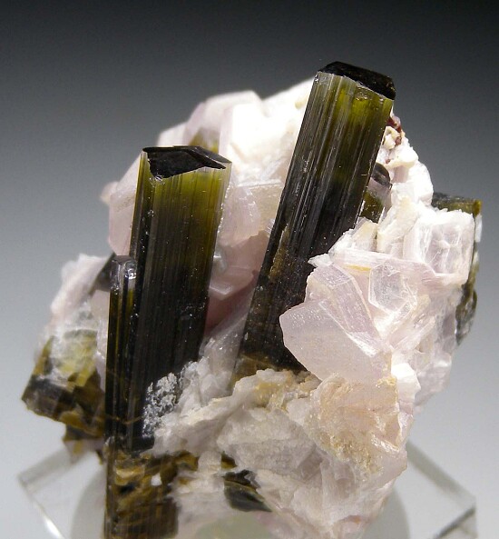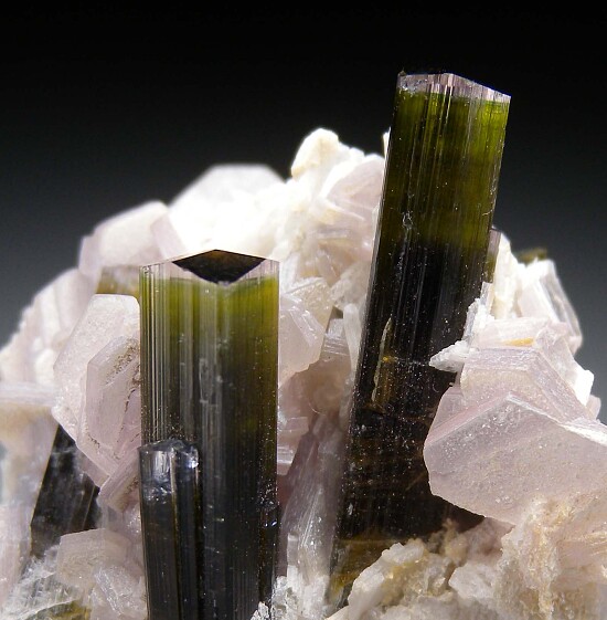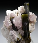 Tourmaline and Lepidolite crystals on Feldspar from Stak Nala. The Tourmaline crystals reach 3.3cm in length, are well terminated, and grade from dark green at the base up to medium green with thin colorless zones at the terminations.
